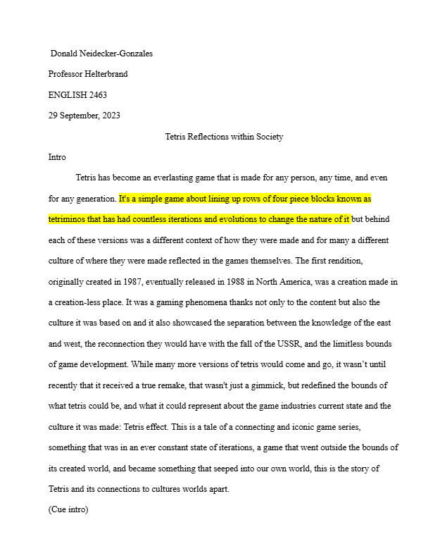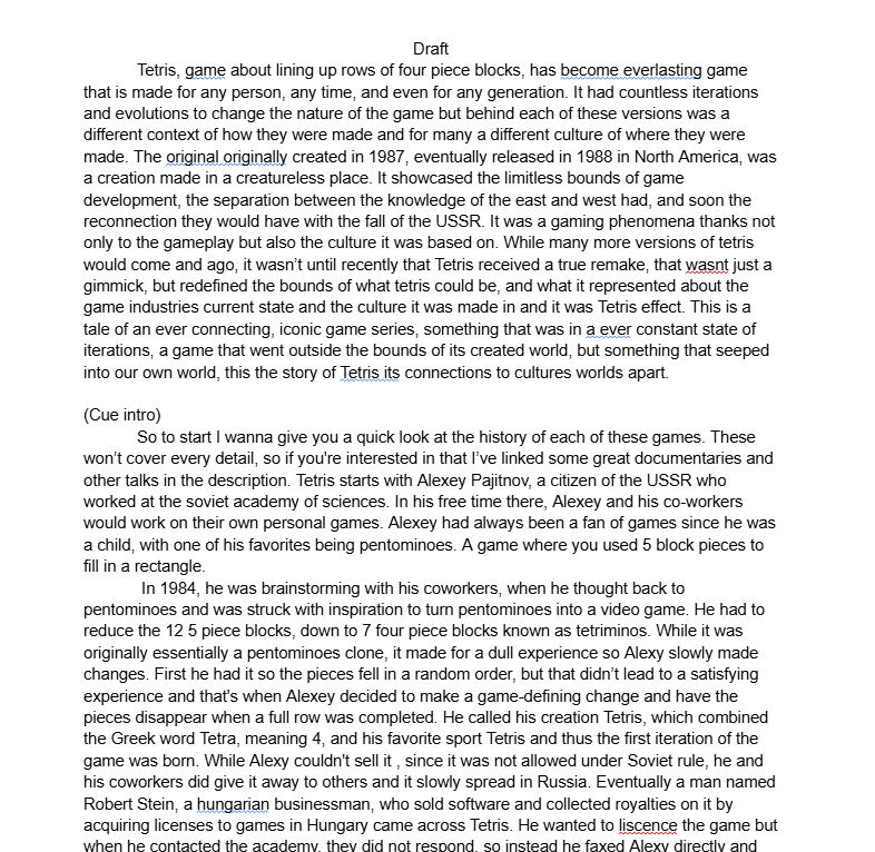 This is a video essay done for a class assignment that asked to discuss what the given game says or said about the current or past social, cultural, economic, and/or political status of the world. I chose to make a video about Tetris as its an evergreen game, that consistently remains relevant. This video specifically discuss what Tetris intitally revealed about the culture it was created in, and what one of the recent renditions now says about modern society and culture.