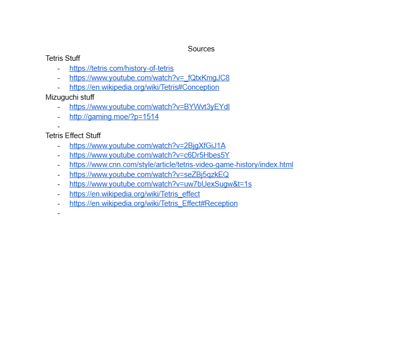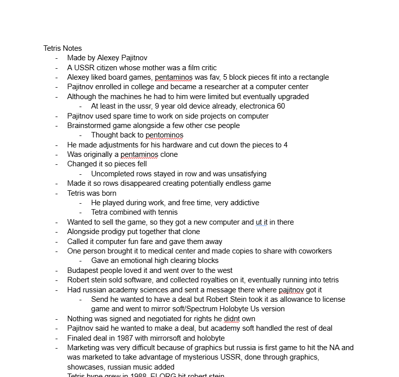 After selecting Tetris as the game to study, I decided I would look at what the original Tetris revealed about the soviet game industry it was made. I then decided to look at a modern version of the game, Tetris Effect, and studyu what it tells us about the modern game industry and how games can be reinvented for new audiences. In order to get a better understanding of these games, I went through dozens of articles, documentarys and even talks given by the developers themselves and recording the information down in a document.