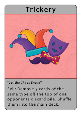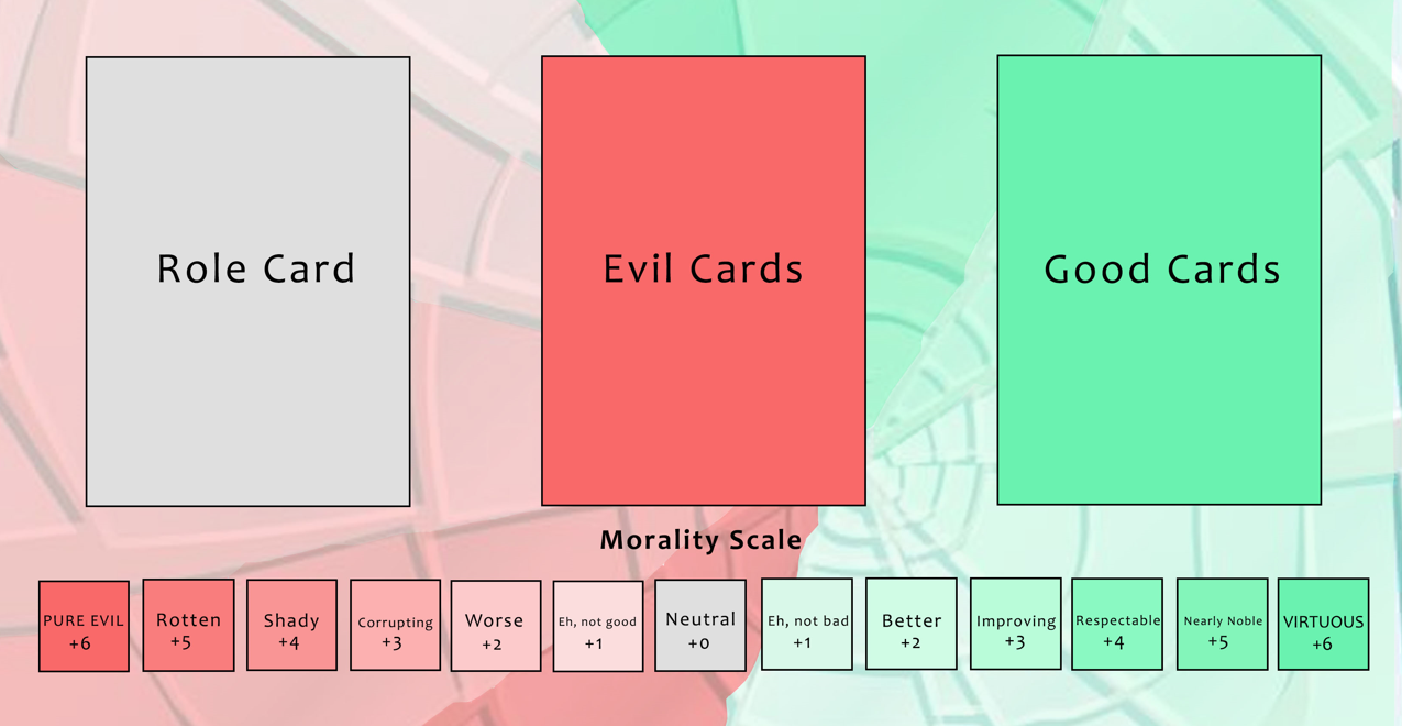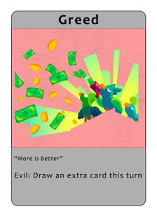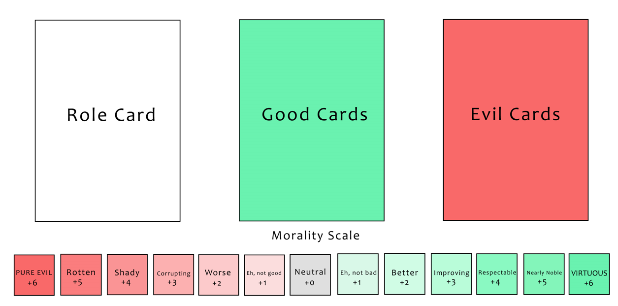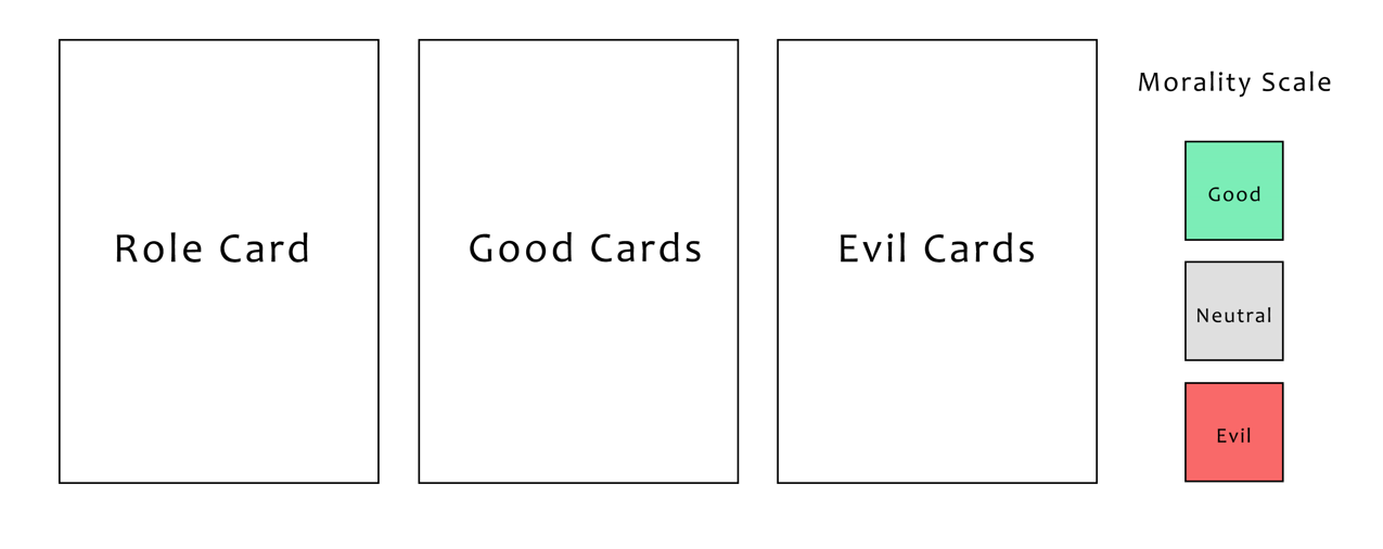 For the card templates, I designed something minimalistic that players could decipher quickly. This can be seen through the shorter description and the colored backs which corresponds with the type of morality (good or evil).