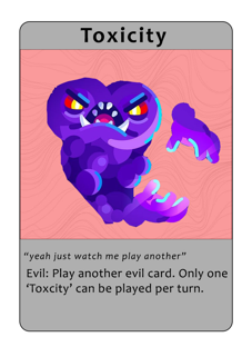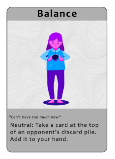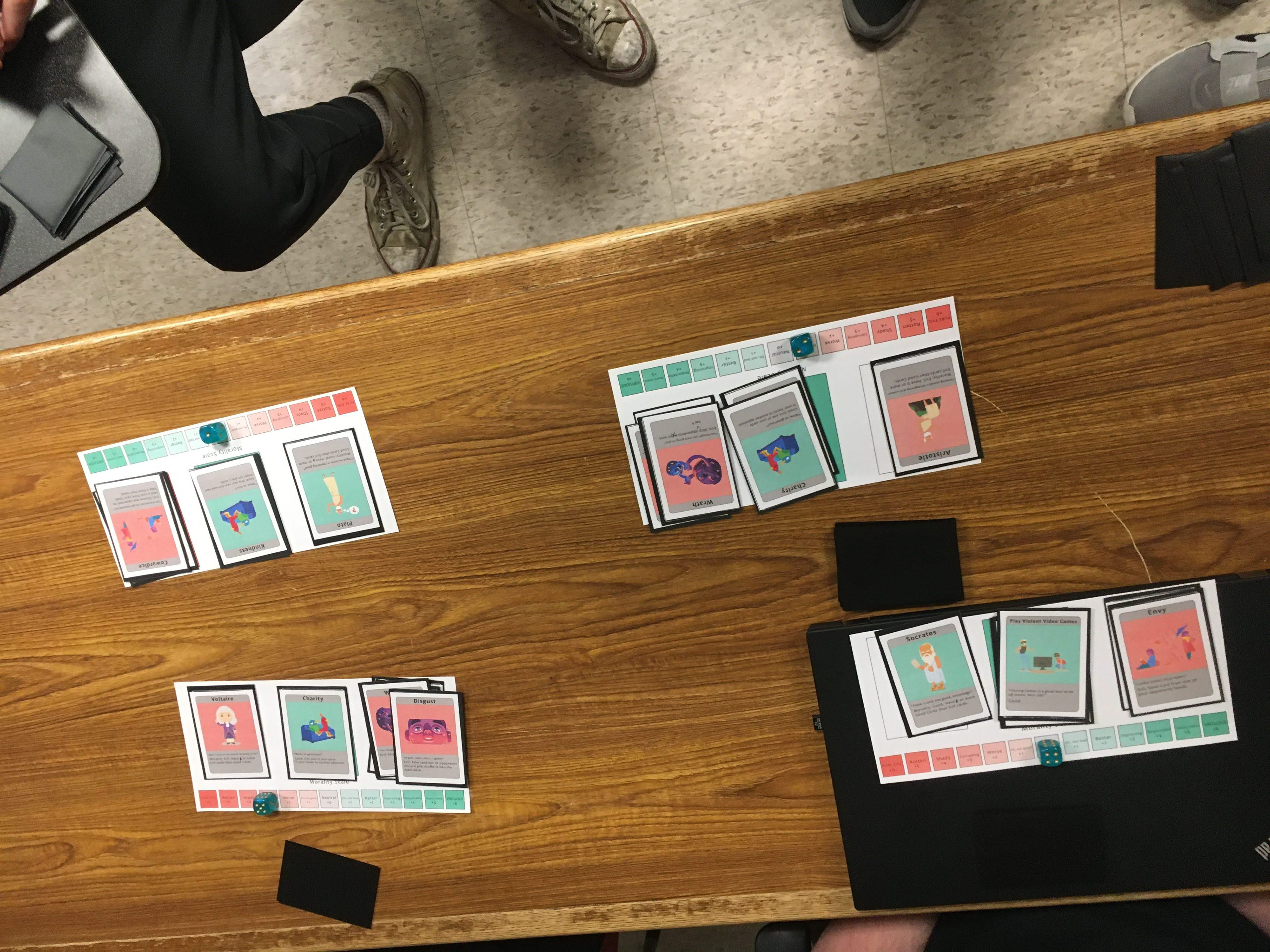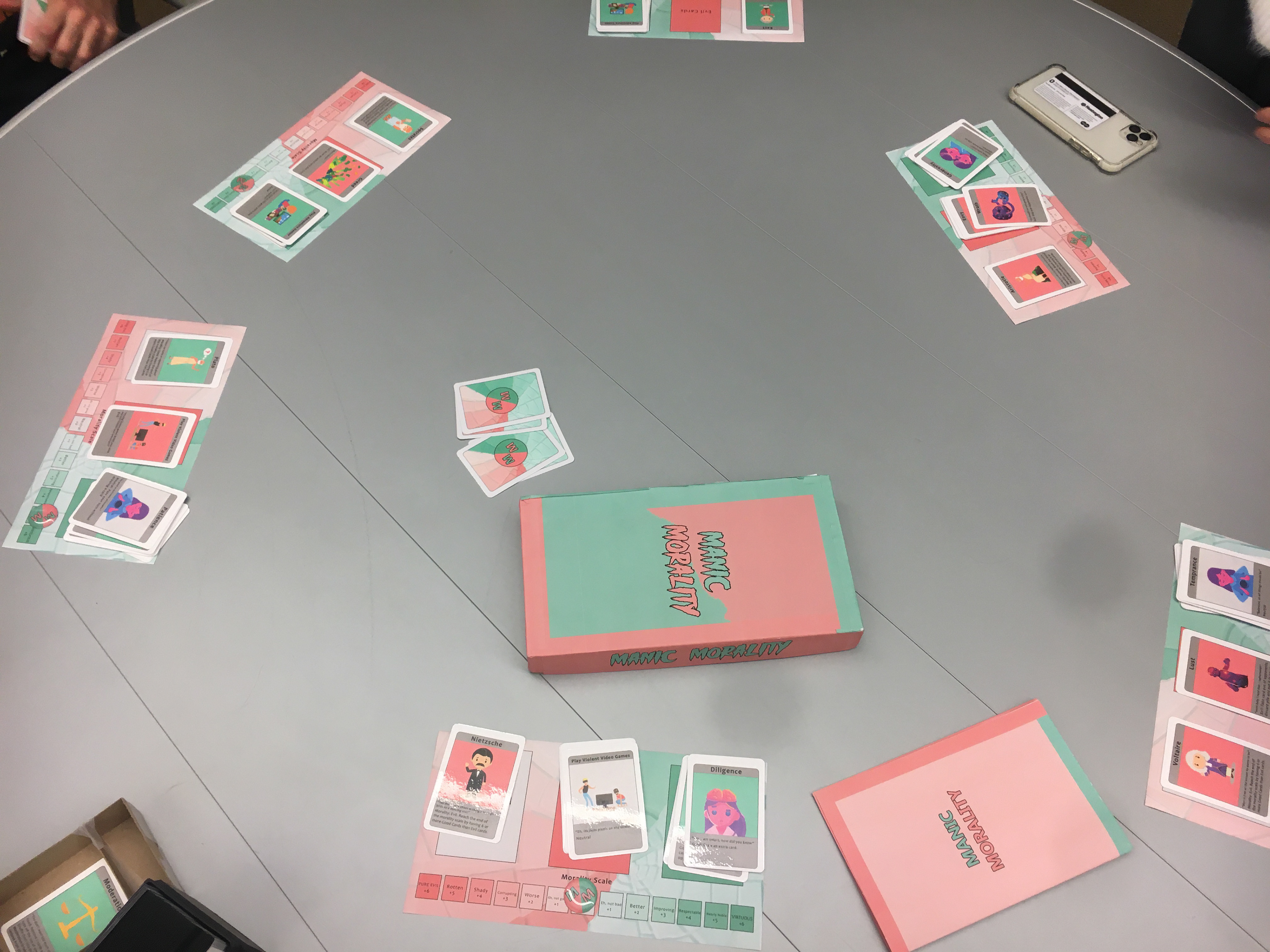 In the first prototype of Manic Morality, rather than players trying to get a specific amount of a type of card, they played through the entire deck and saw what morality they ended up in. Games usually ended with multiple winners and dragged on because you would have to play through the entire deck. There were also no cards that could directly target, and sabotage other players, meaning matches were very passive.