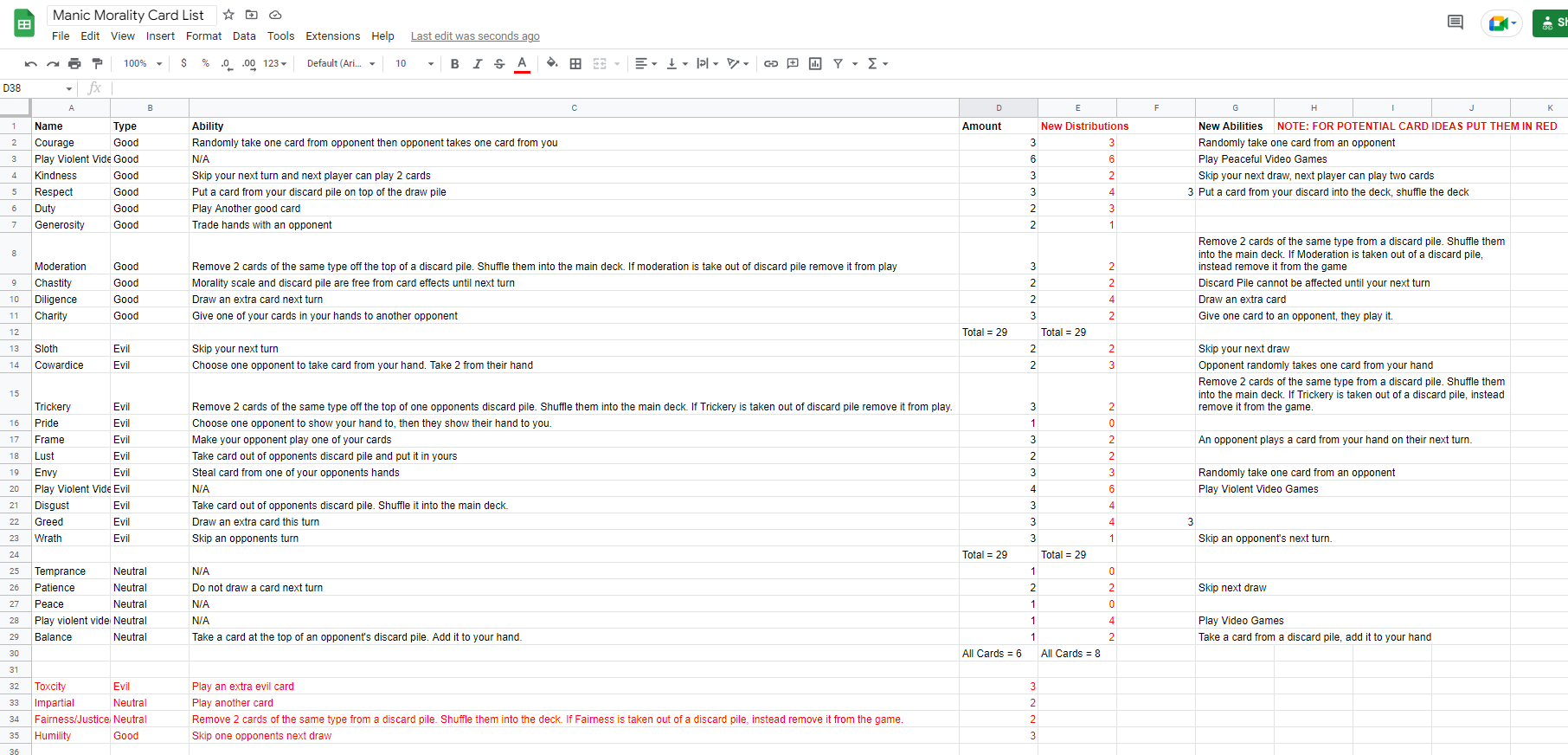 To make sure playing as a good philosopher or evil philosopher was balanced out, I created a google sheet document with all the info of each card such as the amount of each and their ability. Then our group worked together to create a balanced amount of each card as well as new cards to enhance the game.