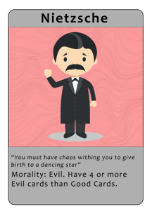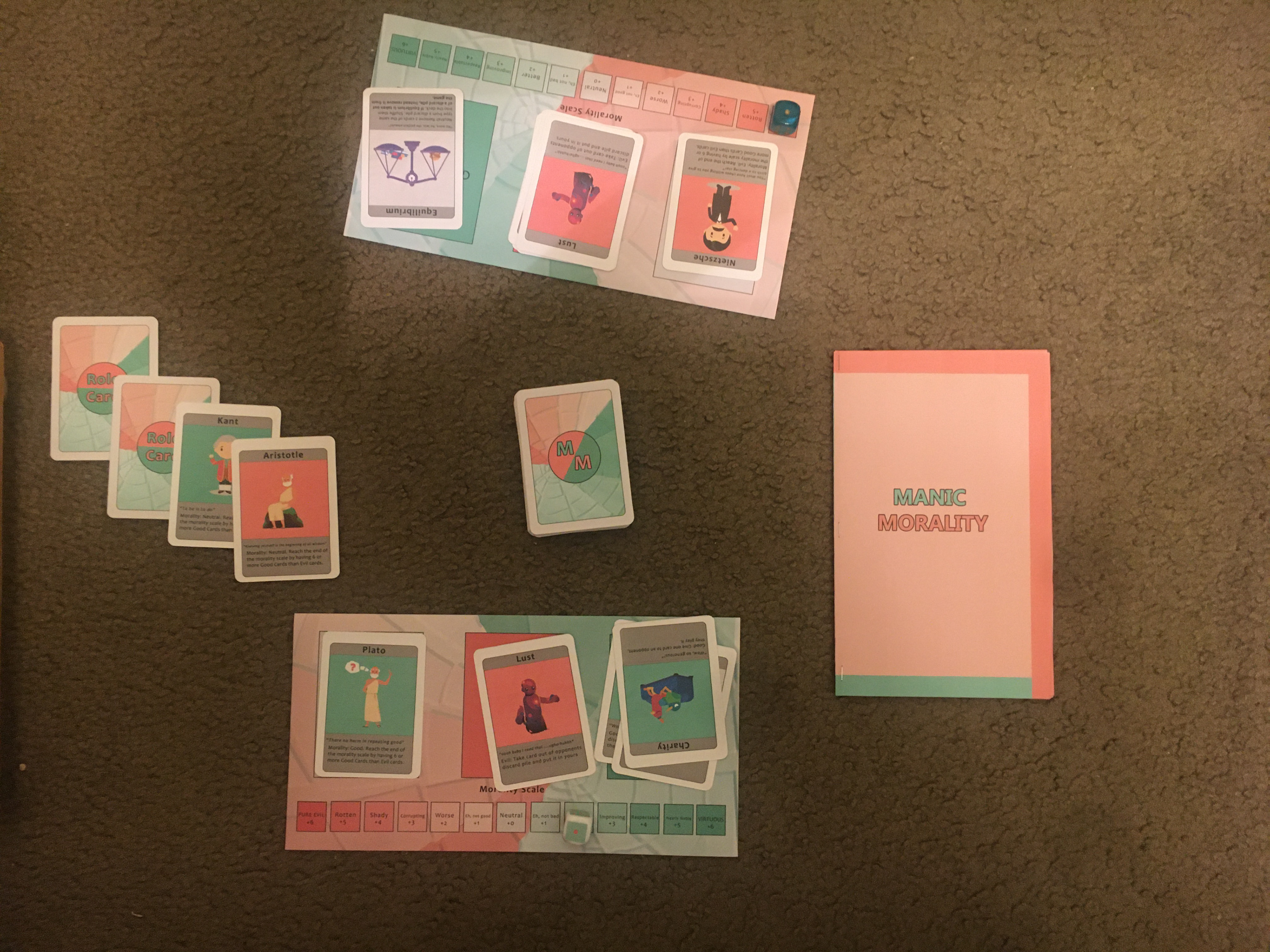 For this project, our group had the semester to pursue any project we wanted as long as it related to philosophy. After discussing for a while we decided on creating a card game, and I constructed the initial concept. To make the game as approachable as possible, I opted to create a party game. What resulted was Manic Morality, a chaotic 2-6 player card game, where players play as good or evil philosophers, that are randomly chosen at the beginning of the game, trying to reach the optimal morality through cards represented by a series of different vices and virtues.