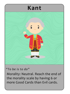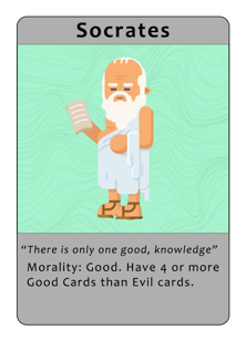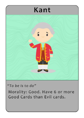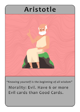 After realizing that the previous rendition was too stagnant and unclear in the goal, our group decided on making it so that there was a clear way to win, by reaching 6 or more of one type of card depending on if you were playing as a good or evil philosopher. Neutral philosophers were completely removed so a player could only be good or bad. Finally, more cards that could target players were added to ensure more strategy in the game.