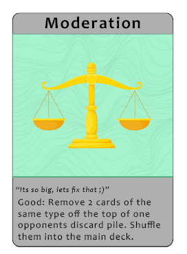 The biggest card additions in this version included Trickery and Moderation, which would allow the player to remove cards from the a players discard pile to slow down their progress in winning. However, they were still quite unbalanced as Trickery was better than Moderation, leading to disadvantages for people playing as good philosophers. Moreover, they could be added back to the deck meaning a game could go on for a while without a winner as players continuously played these cards against each other.