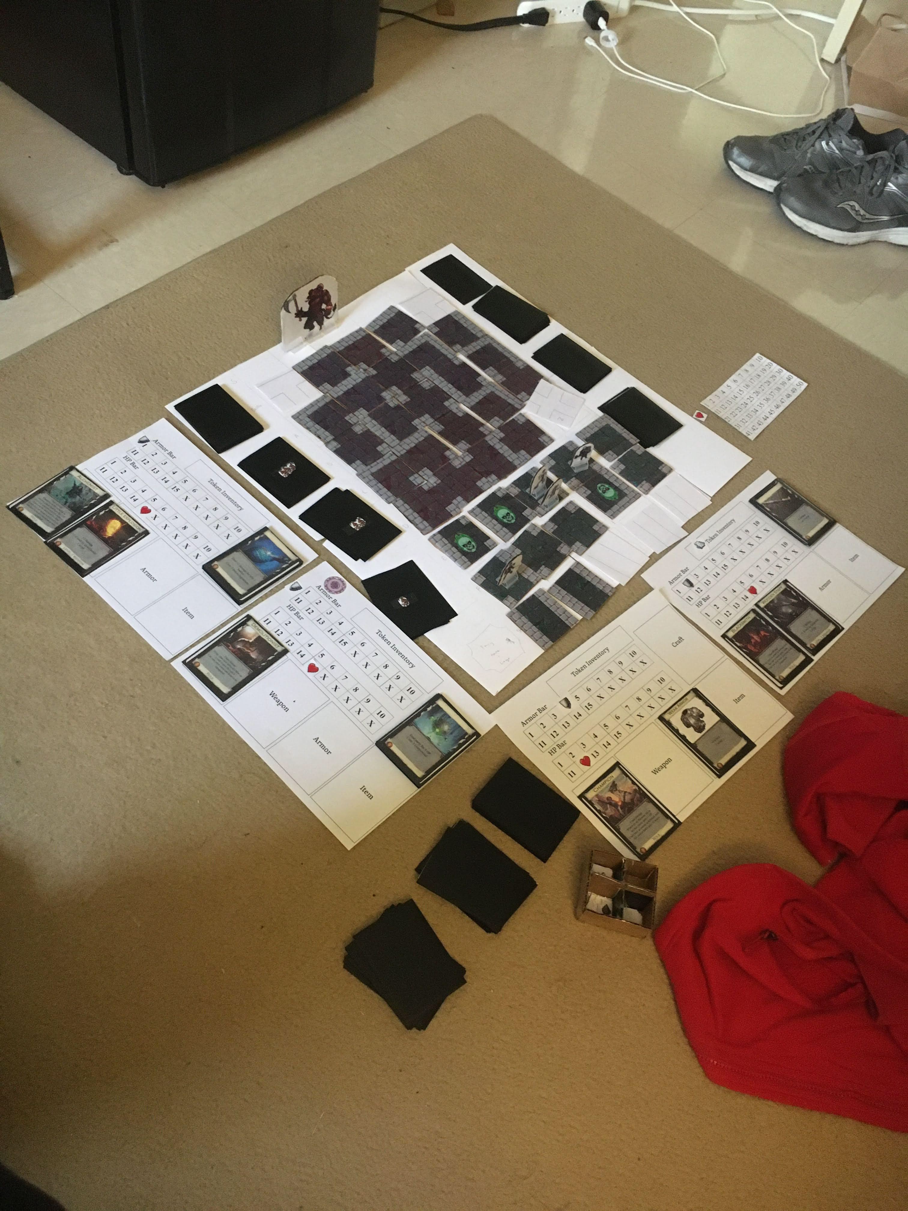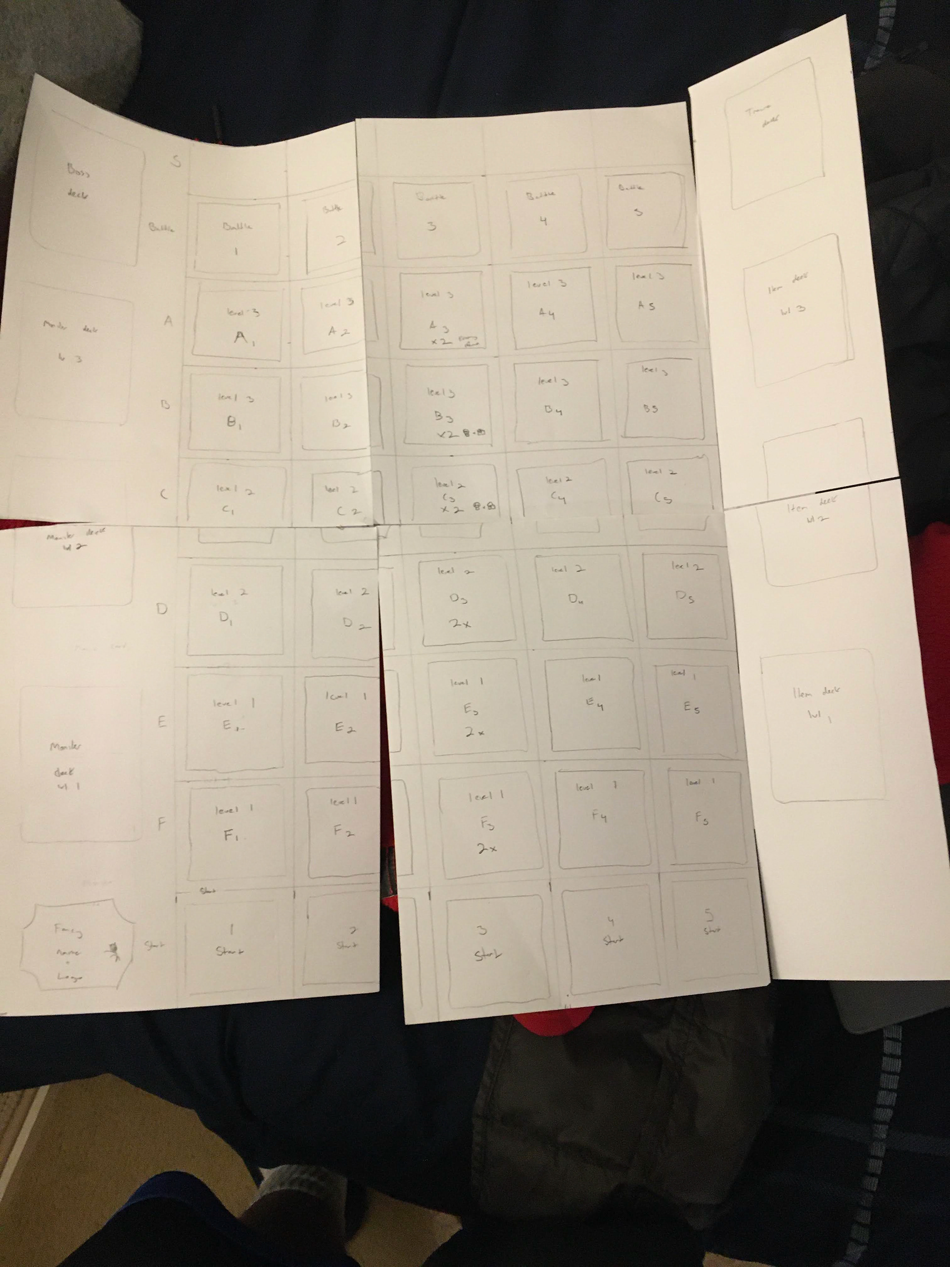 Since we only had two weeks to make the game, I created a quick drawn prototype of what a board would look like in addition to basic cards. The biggest problem in this first version was that players would continue to fight monsters until they were way over leveled for the next section. This not only made the game boring because the players could easily wipe out anything in their path but also really slowed down the pacing of the game.